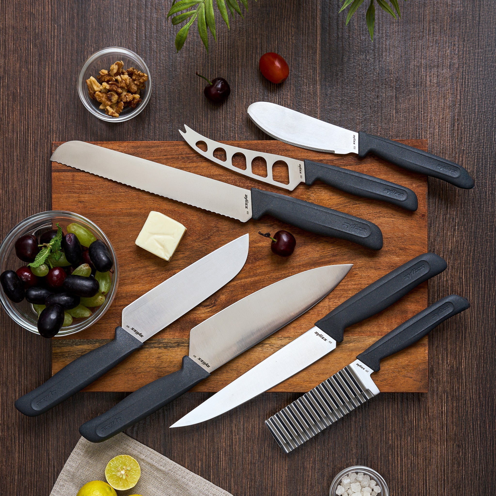 The Zyliss Utility Knife Collection expands with seven new essentials: Cheese, Spreading, Crinkle Cut, Large Santoku, Large Chef, Carving, and Bread Knives. Each features a high-quality, ultra-sharp stainless steel blade with an ergonomic wheat straw handle that reduces plastic by up to 20%. Food safe, dishwasher safe, and complete with easy-insert blade guards (except for the spreading knife).