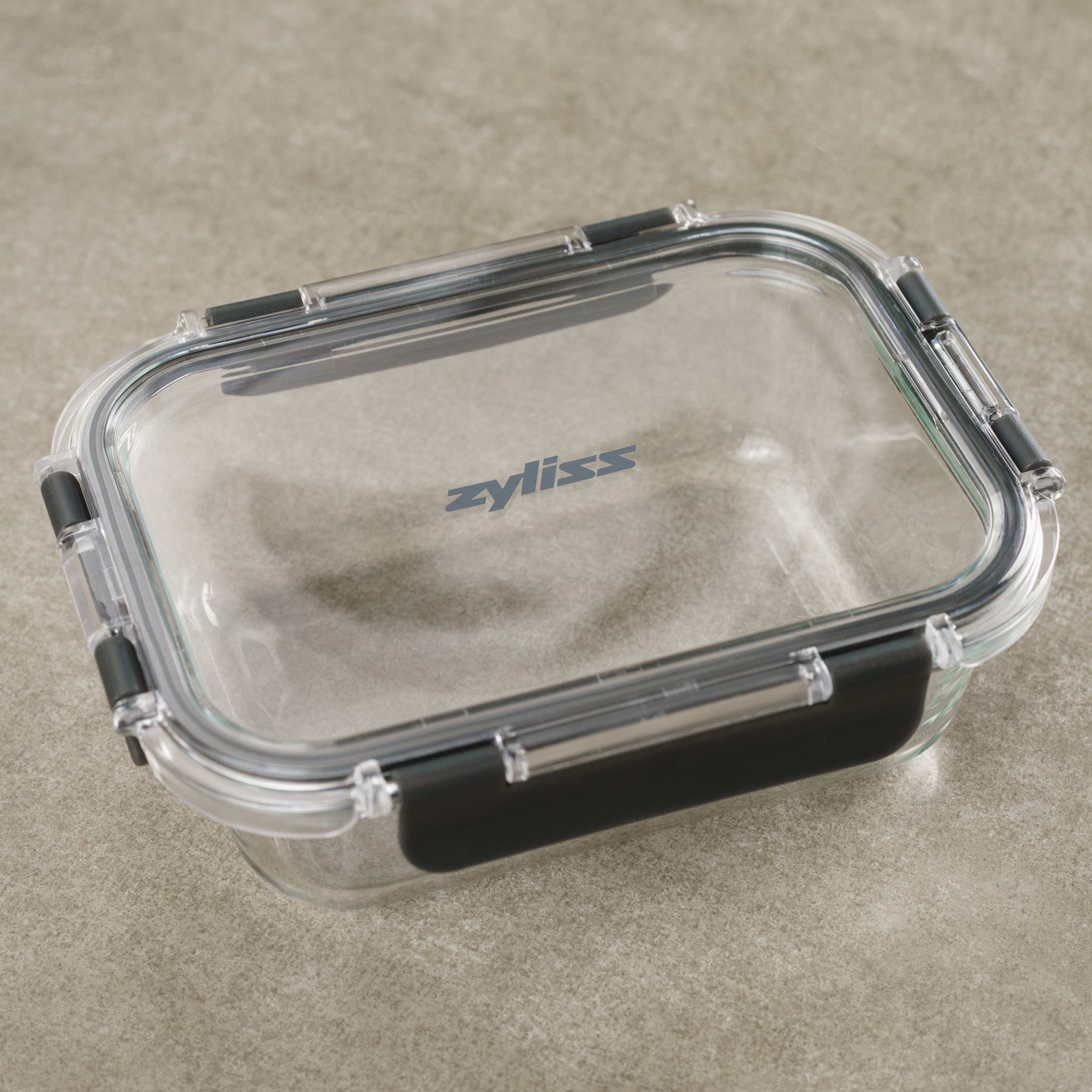 • The Zyliss Glass Container features a clear rectangular design, transparent lid with four black locking clips for a secure seal, and the Zyliss logo printed on the lid—ideal for meal prep. #1.52L/1.61qt